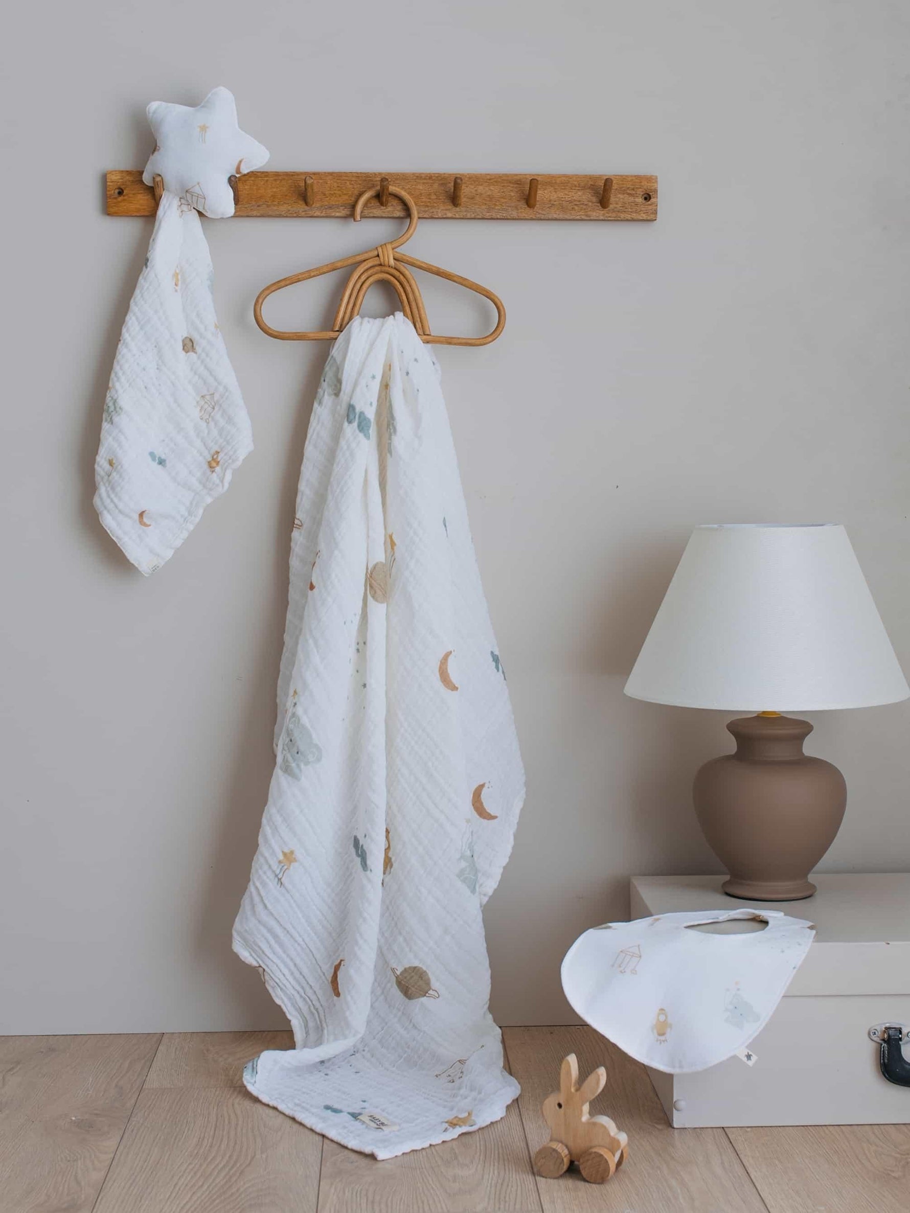 - Bir adet 110x110 ebat müslin örtü, bir adet uyku arkadaşı, bir adet sıvı geçirmez önlükten oluşan 3 parçalı set.