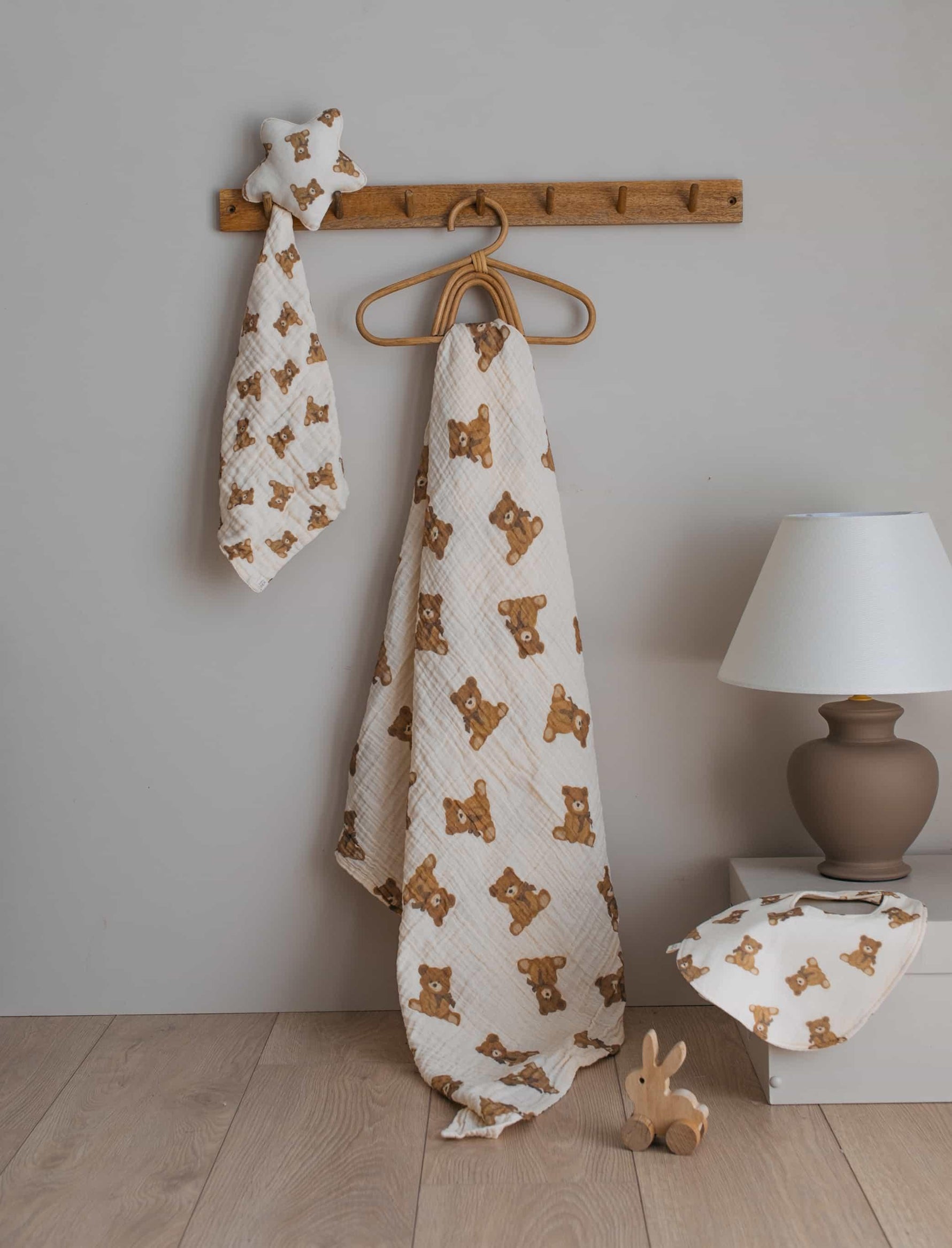 - Bir adet 110x110 ebat müslin örtü, bir adet uyku arkadaşı, bir adet sıvı geçirmez önlükten oluşan 3 parçalı set.