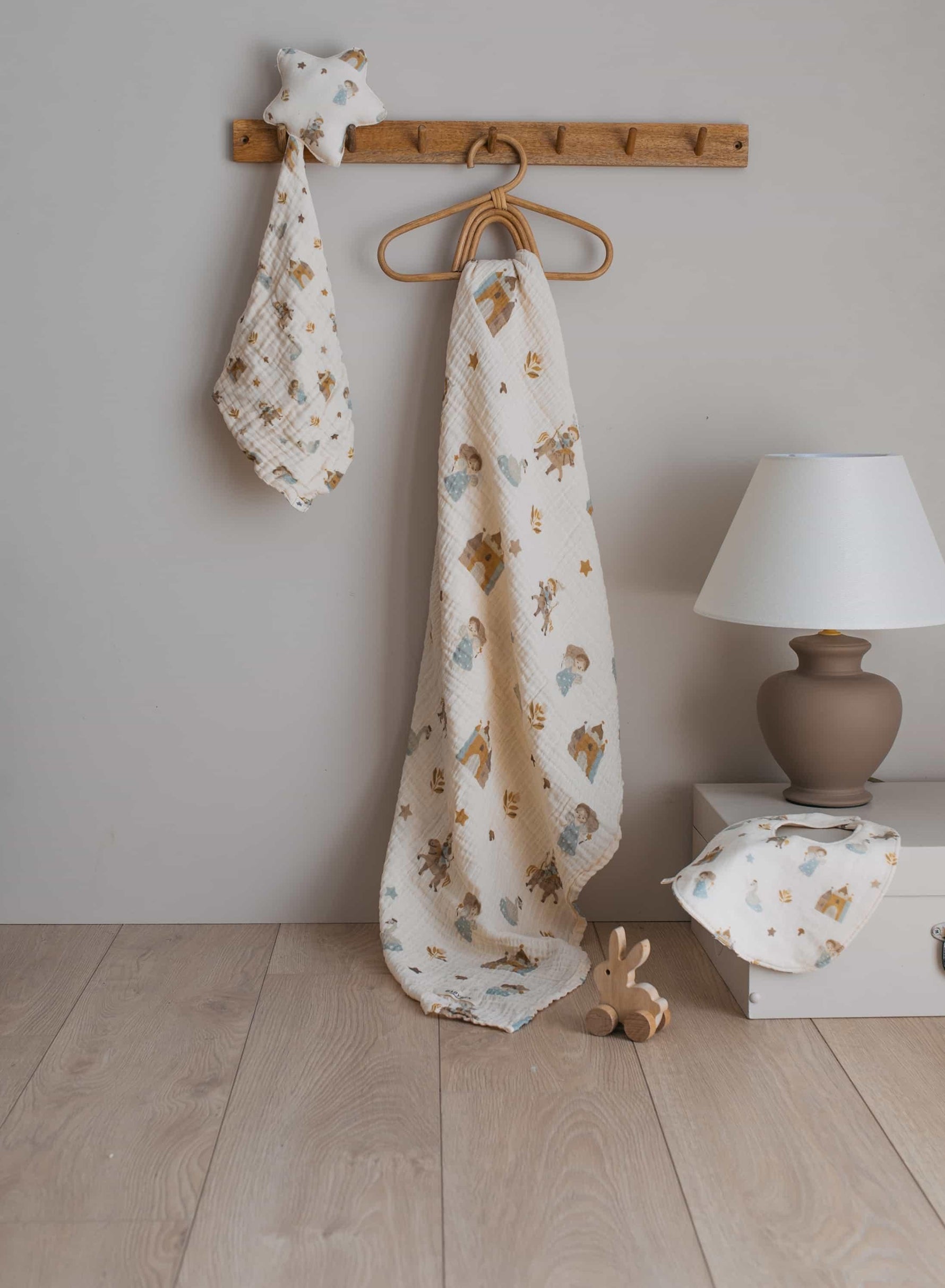 - Bir adet 110x110 ebat müslin örtü, bir adet uyku arkadaşı, bir adet sıvı geçirmez önlükten oluşan 3 parçalı set.