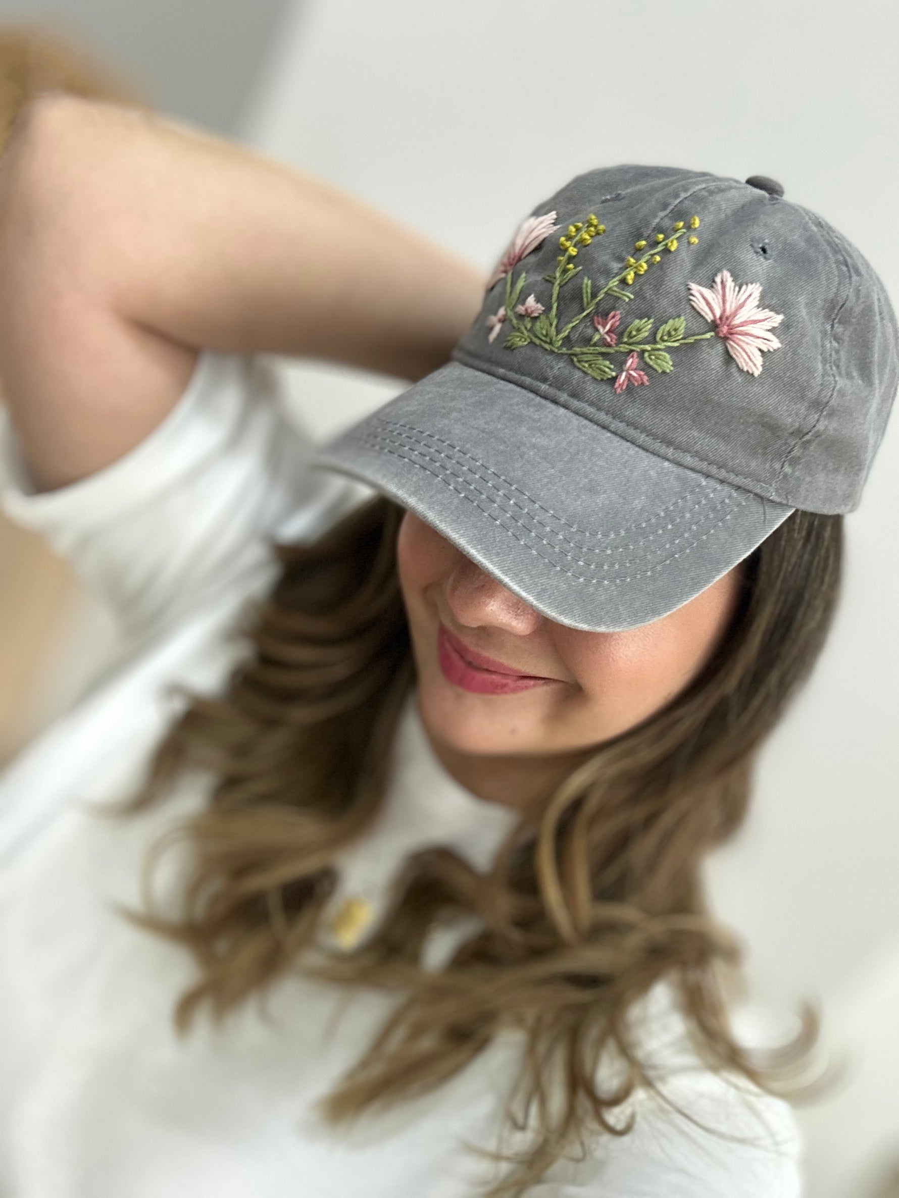 Şıklığı ve zarafeti bir araya getiren bu özel tasarım şapka, gününüzü renklendirecek! Yumuşak gri tonları üzerinde yer alan el işçiliği nakış detayları, doğadan ilham alınarak tasarlanmıştır. Dayanıklı kumaşı ve rahat yapısıyla hem günlük kombinlerinizde hem de özel anlarınızda stilinizi tamamlar.